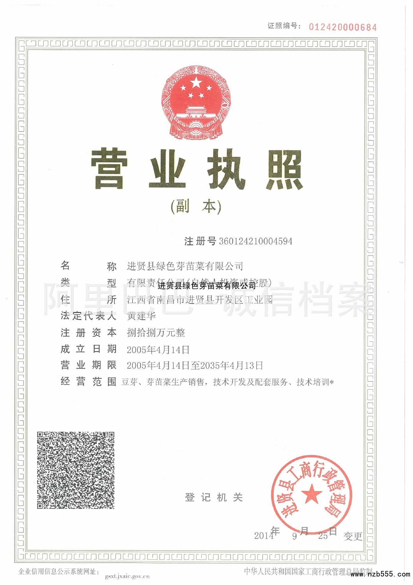 | 發(fā)證機(jī)構(gòu): | 進(jìn)賢縣工商行政管理局 | 發(fā)證時(shí)間 : | 2014-09-25 |