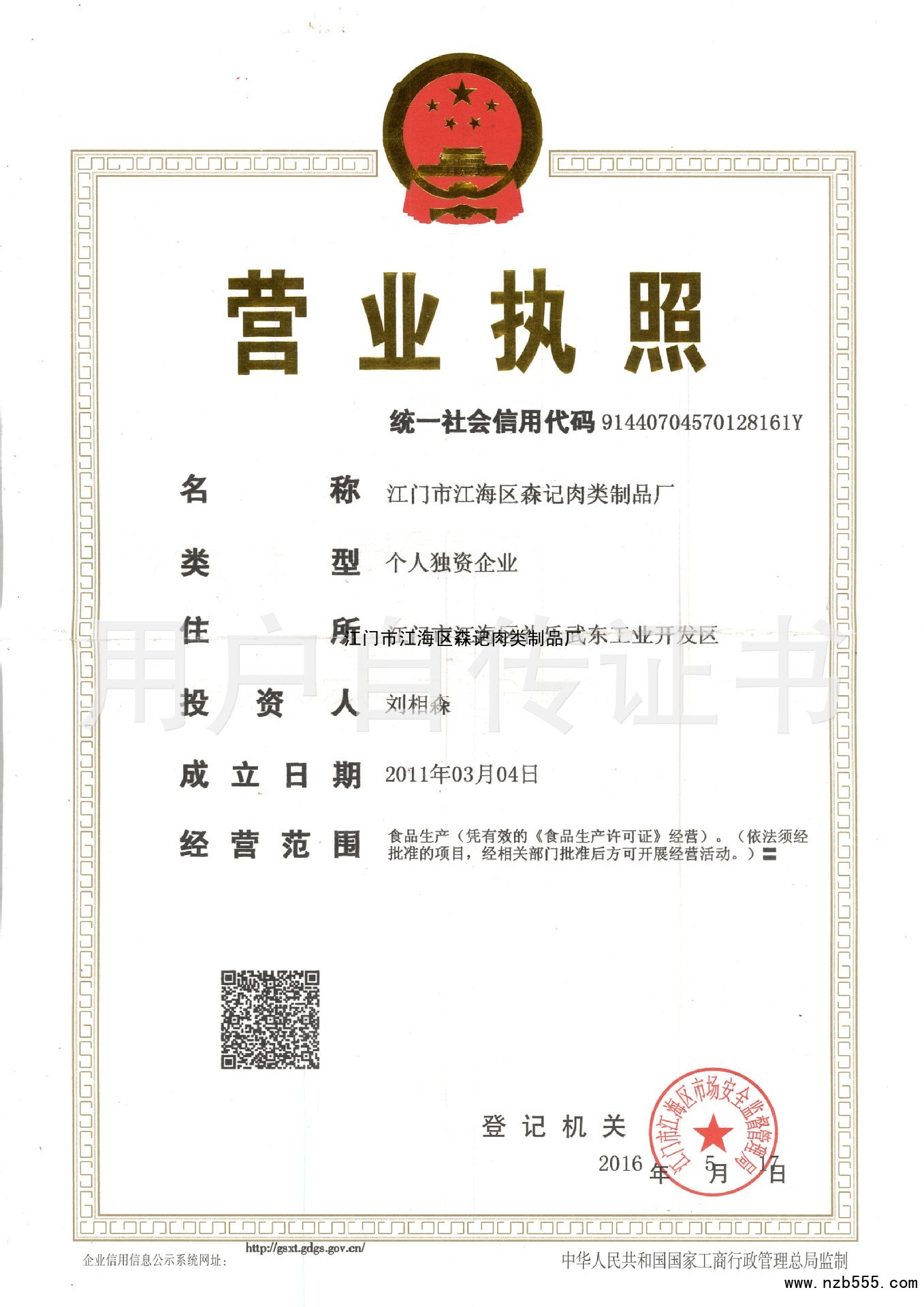 首頁(yè) > 榮譽(yù)資質(zhì) > 江門(mén)市江海區(qū)森記肉類制品