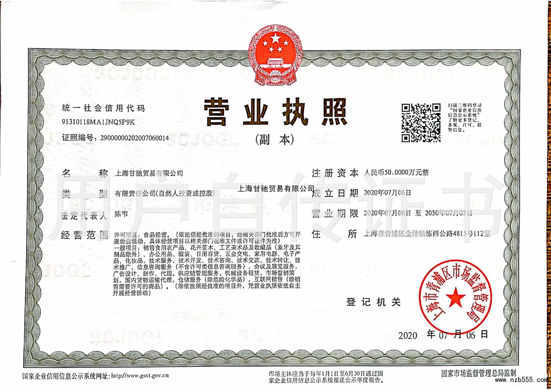 | 發(fā)證機(jī)構(gòu): | 上海市青浦區(qū)市場(chǎng)監(jiān)督管理局 | 發(fā)證時(shí)間 : | 2020-07-06 |