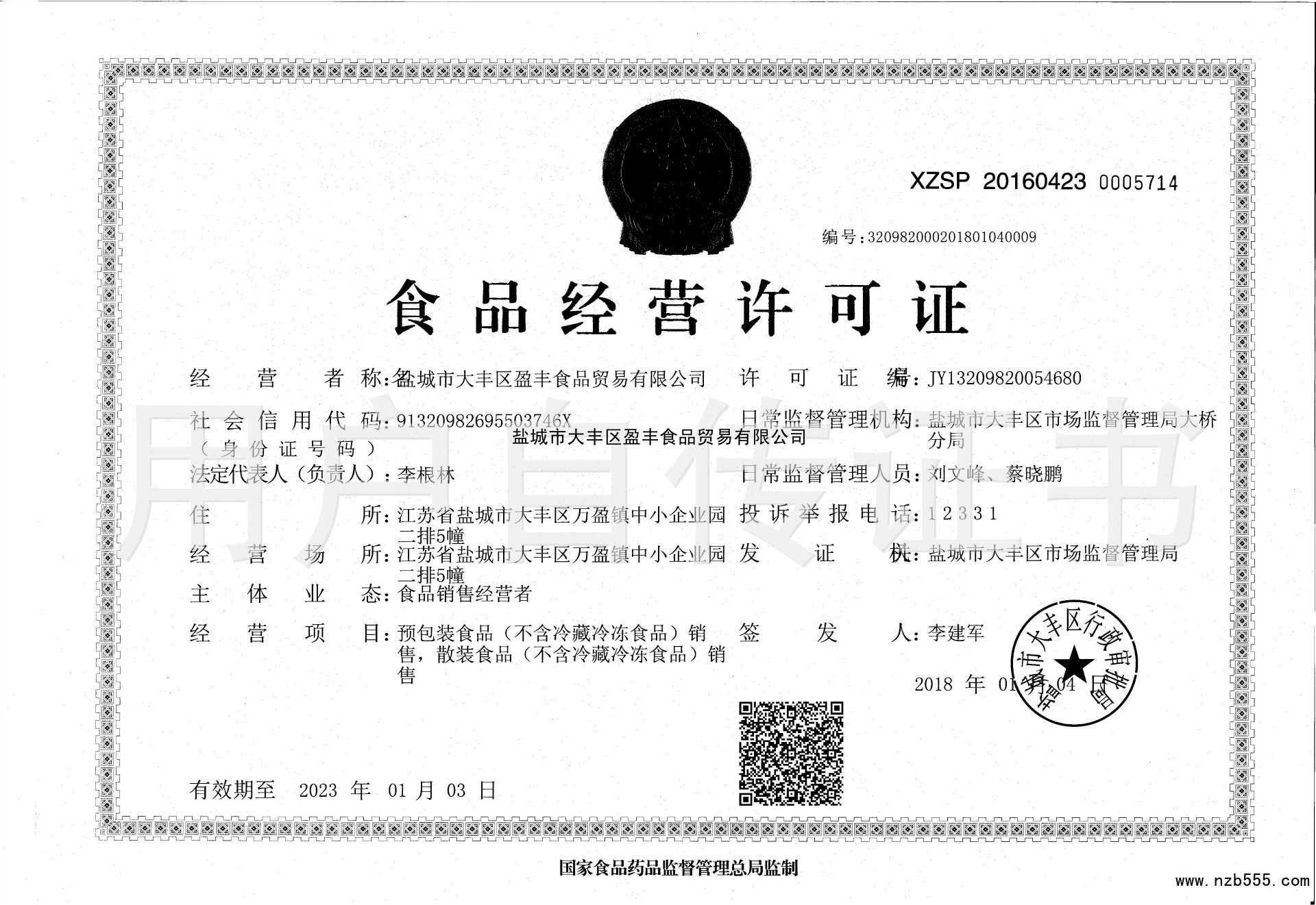 | 發(fā)證機(jī)構(gòu): | 鹽城市大豐區(qū)行政審批局 | 發(fā)證時(shí)間 : | 2018-01-04 |