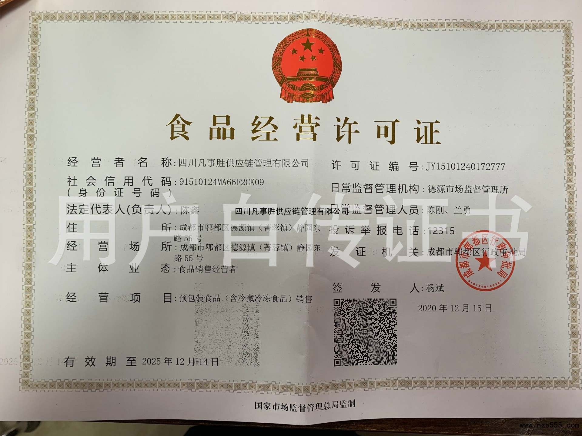 | 發(fā)證機(jī)構(gòu): | 成都市郫都區(qū)行政審批局 | 發(fā)證時間 : | 2020-12-15 |