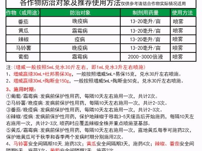 | 辣椒 | 疫病 | 15-25毫升/畝 | 噴霧 |